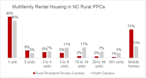 PPCs generally have less multifamily housing, than other counties. Nationwide, approximately 65% of all rentals in PPCs are in properties with fewer than five units. In North Carolina, 59% of rentals in PPCs are in properties with fewer than five units, compared to the statewide rate of 52%.