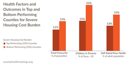 A newly released study by County Health Rankings & Roadmaps finds that households who are severely cost-burdened (spend 50% or more of their income on housing) suffer significant harm in a number of health areas. Counties with the highest housing cost burden have consistently worse health outcomes than those with the lowest burden: every 10% increase in the share of severely cost-burdened families is linked to 86,000 more people who are food insecure, 29,000 more children in poverty, and 84,000 more adults in less-than-good health. Furthermore, counties with greater residential segregation have higher rates of severe housing cost burdens for everyone, but especially for black households.